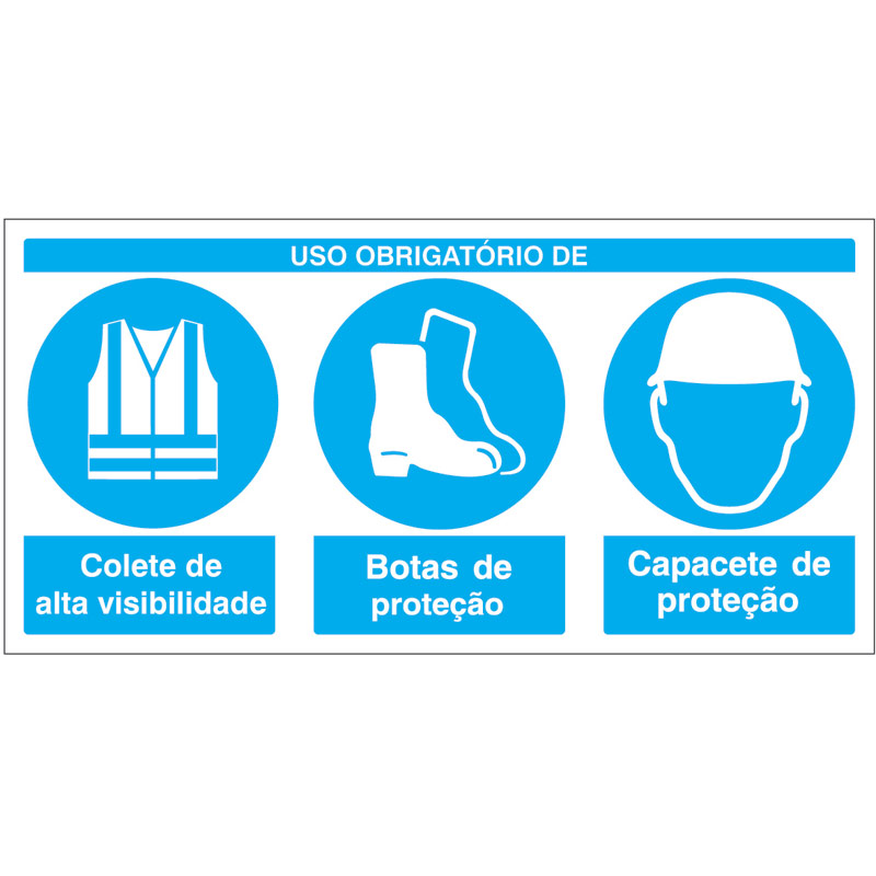 Sinal composto de OBRIGAÇÃO DE USO DE COLETE DE ALTA VISIBILIDADE, BOTAS E CAPACETE DE PROTEÇÃO, para identificação e sinalização da necessidade de uso de equipamentos de proteção