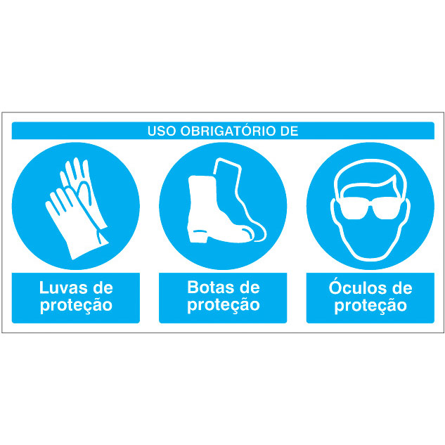Sinal composto de OBRIGAÇÃO DE USO DE LUVAS, BOTAS E ÓCULOS DE PROTEÇÃO, para identificação e sinalização da necessidade de uso de equipamentos de proteção