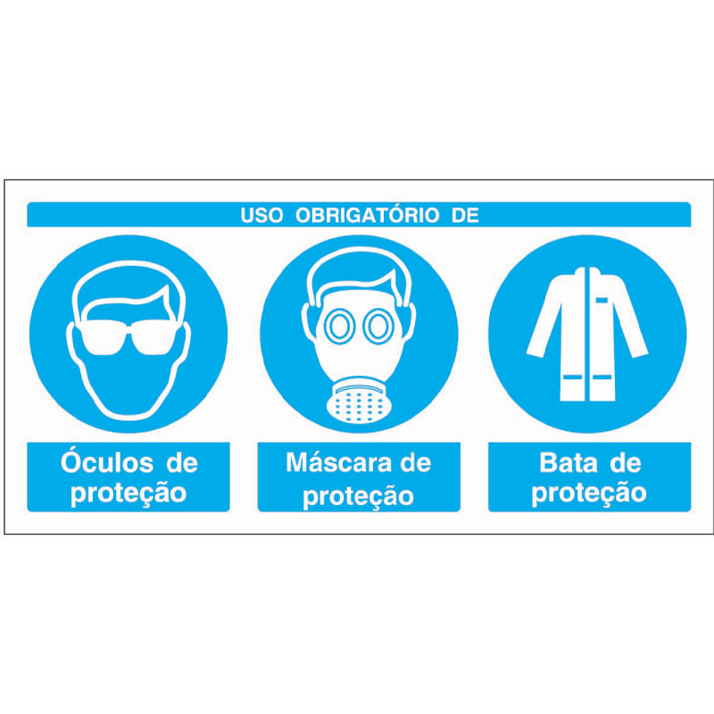 Sinal composto de OBRIGAÇÃO DE USO DE ÓCULOS, MÁSCARA PARA PÓS E FUMOS E BATA DE PROTEÇÃO, para identificação e sinalização da necessidade de uso de equipamentos de proteção