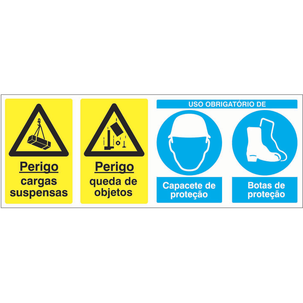 Sinal composto de PERIGO CARGAS SUSPENSAS / QUEDA DE OBJETOS E USO DE CAPACETE E BOTAS DE PROTEÇÃO, para sinalização e identificação de advertência e perigo e identificação e sinalização da necessidade de uso de equipamentos de proteção