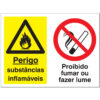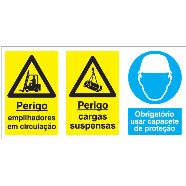 Sinal composto de PERIGO EMPILHADORE EM CIRCULAÇÃO / CARGAS SUSPENSAS E OBRIGAÇÃO DE USO DE CAPACETE DE PROTEÇÃO, para sinalização e identificação de advertência e perigo e identificação e sinalização da necessidade de uso de equipamentos de proteção