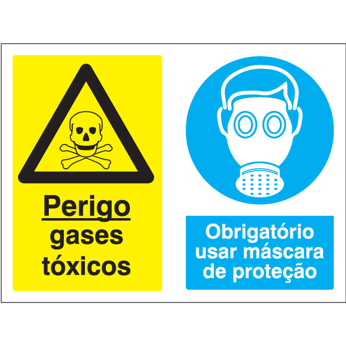 Sinal composto de PERIGO DE GASES TÓXICOS E OBRIGAÇÃO DE USO DE MÁSCARA DE PROTEÇÃO, para sinalização e identificação de advertência e perigo e para identificação e sinalização da necessidade de uso de equipamentos de proteção