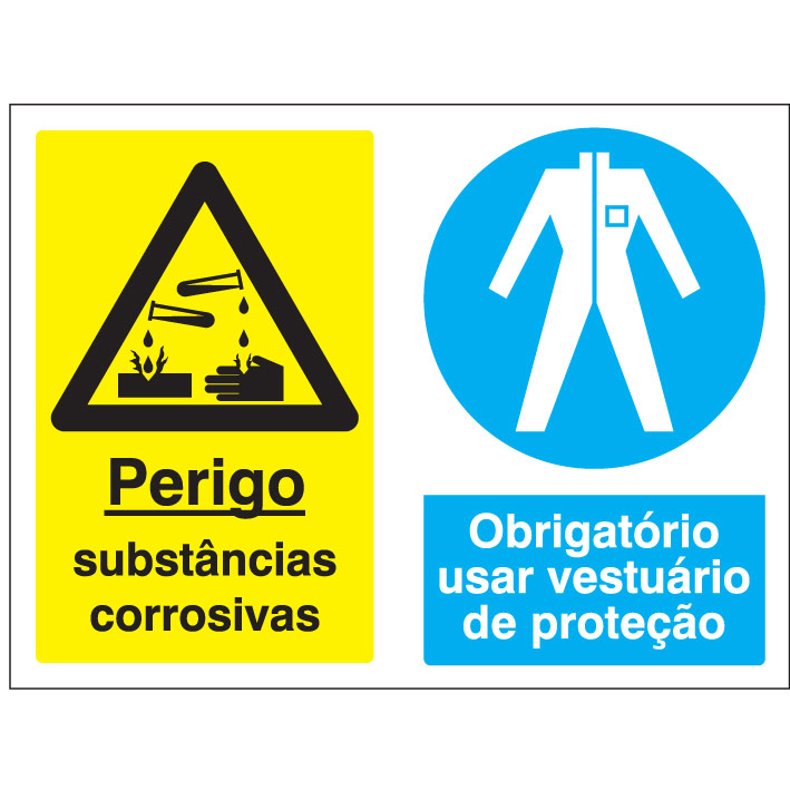 Sinal composto de PERIGO DE SUSBTÂNCIAS CORROSIVAS E OBRIGAÇÃO DE USO DE VESTUÁRIO DE PROTEÇÃO, para sinalização e identificação de advertência e perigo e para identificação e sinalização da necessidade de uso de equipamentos de proteção