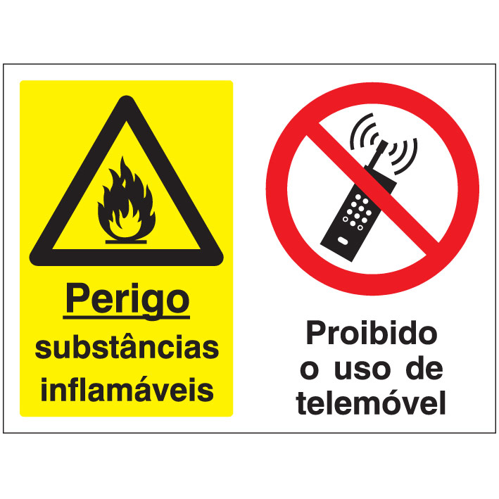 Sinal composto de PERIGO DE SUBSTÂNCIAS INFLAMÁVEIS E PROIBIDO O USO DE TELEMÓVEL, para sinalização e identificação de advertência e perigo e identificação e sinalização comportamentos de risco