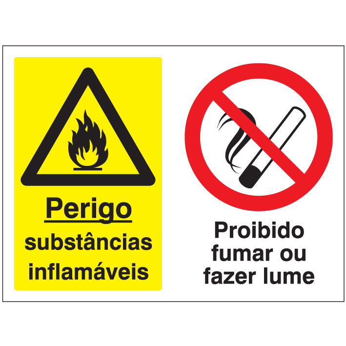 Sinal composto de PERIGO DE SUBSTÂNCIAS INFLÁVEIS E PROIBIDO FUMAR OU FAZER LUME, para sinalização e identificação de advertência e perigo e identificação e sinalização comportamentos de risco