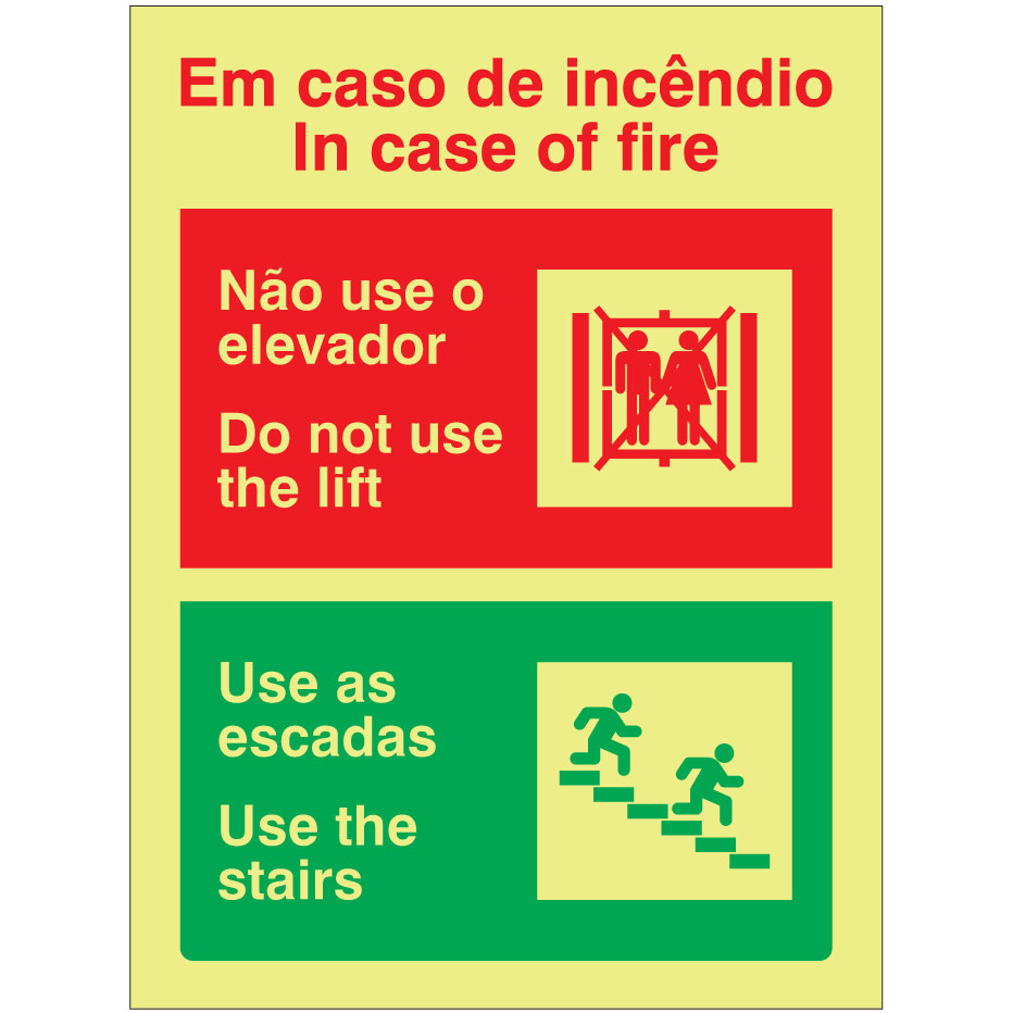 Sinal de EM CASO DE INCÊNDIO / NÃO USE O ELEVADOR / USE AS ESCADAS, para sinalização e identificação de sistemas de alarme e equipamentos de extinção de incêndios