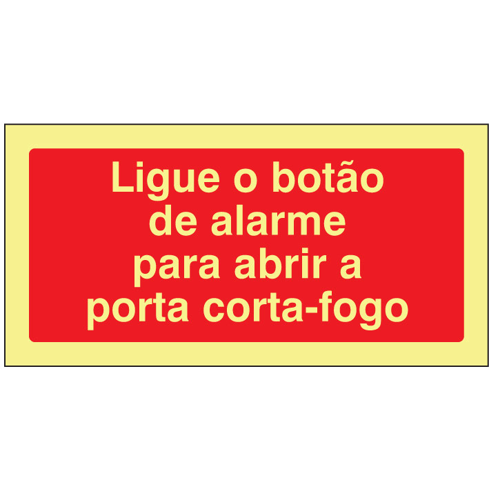 Sinal de LIGUE O BOTÃO DE ALARME PARA ABRIR A PORTA CORTA-FOGO, para sinalização e identificação de sistemas de alarme e equipamentos de extinção de incêndios