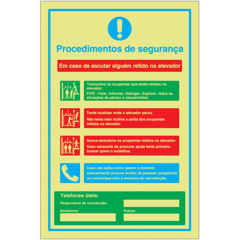 Sinal de PROCEDIMENTOS DE SEGURANÇA INCÊNDIO / RETIDO NO ELEVADOR, para sinalização e identificação de procedimentos de segurança