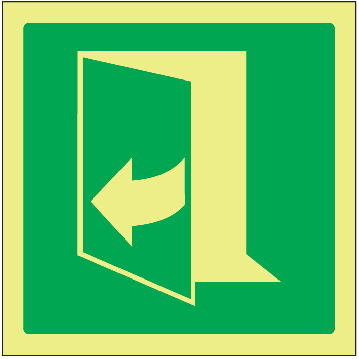 Sinal de ABRIR PORTA PARA FORA PARA A ESQUERDA, para sinalização e identificação de vias de evacuação