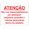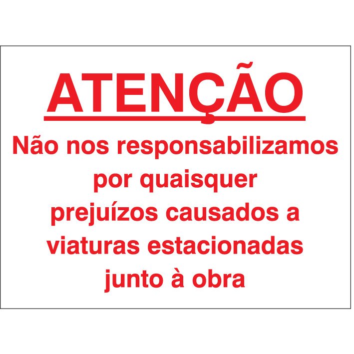 Sinal de ATENÇÃO NÃO NOS RESPONSABILIZAMOS POR QUALQUER PREJUÍZOS CAUSADOS A VIATURAS ESTACIONADAS JUNTO À OBRA, identificação de advertências