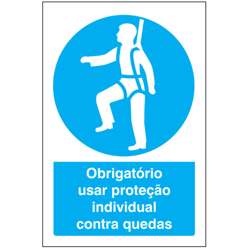 Sinal de OBRIGAÇÃO DE USO DE ARNÊS ANTI-QUEDA, para identificação e sinalização da necessidade de uso de equipamentos de proteção