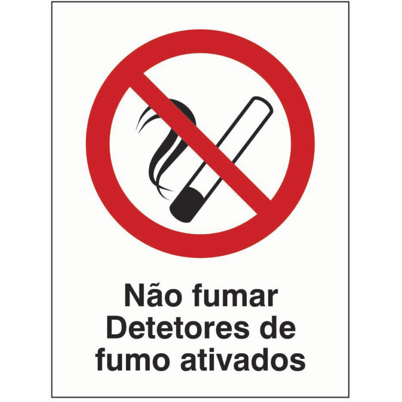 Sinal de PROIBIÇÃO DE FUMAR DETETORES DE FUMO ATIVADOS, para identificação e sinalização comportamentos de risco